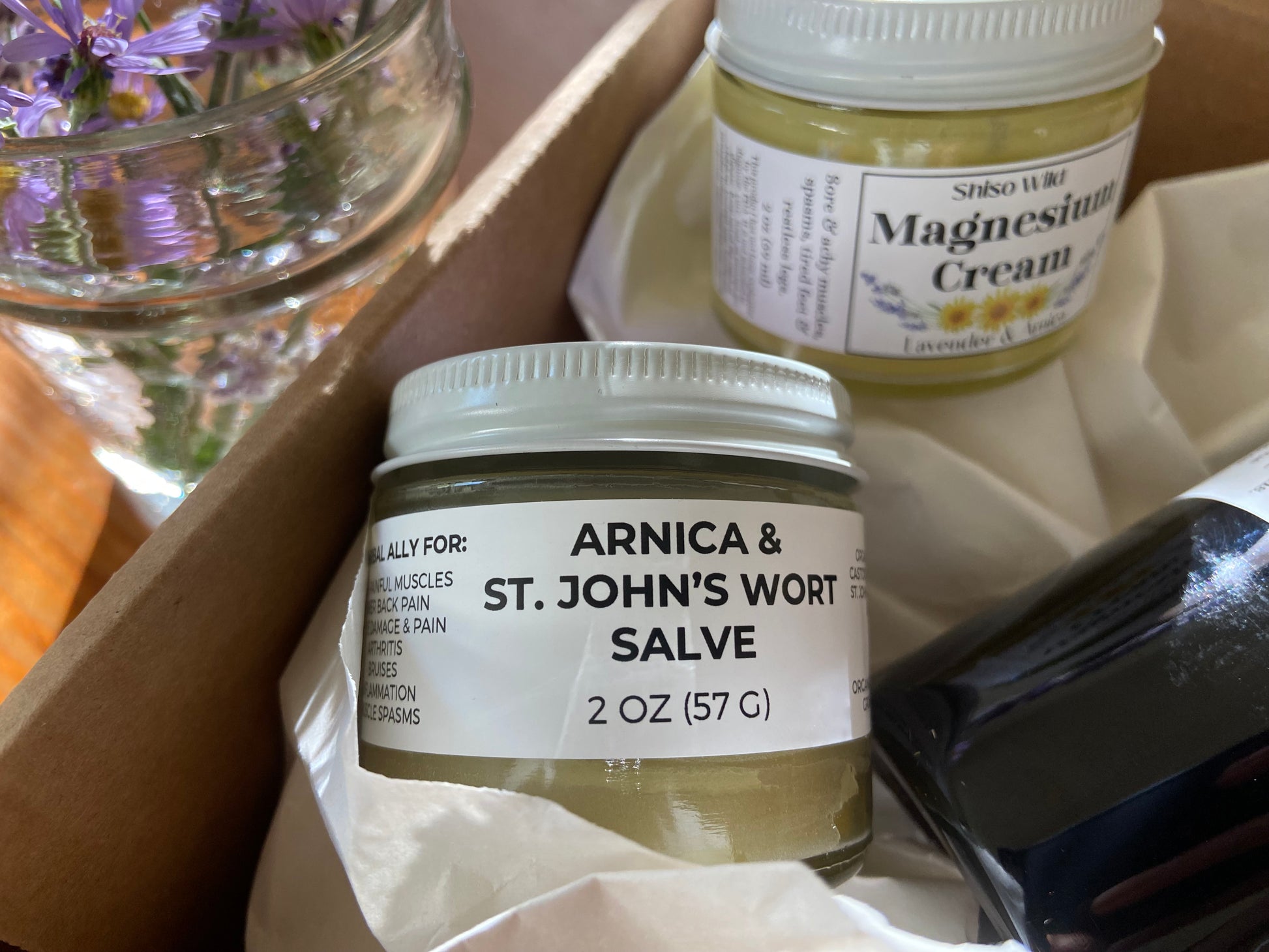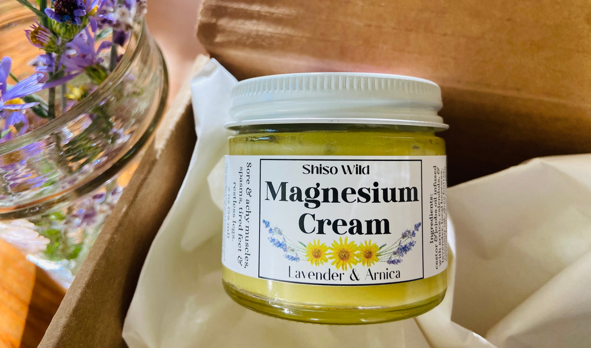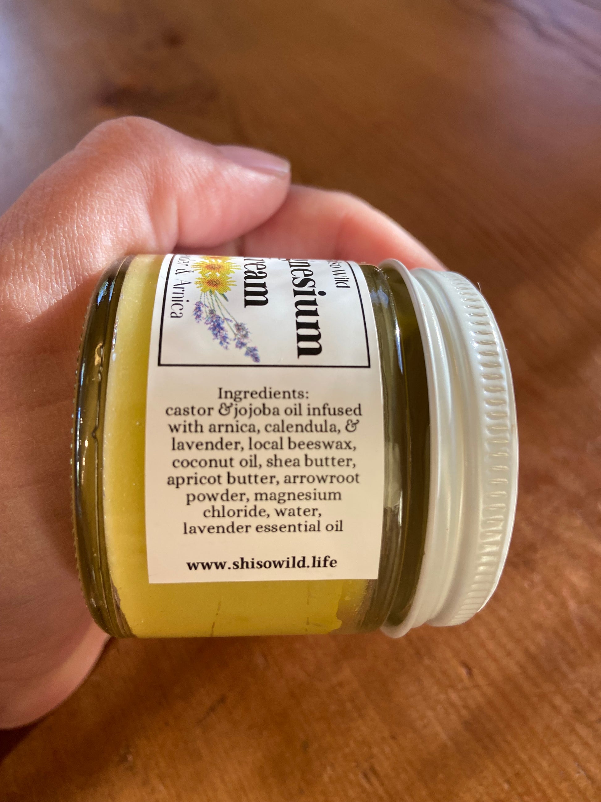 (1) Magnesium Cream. “For sore and achy muscles, tired feet, & restless legs”. 2 ounces. Ingredients: castor & jojoba oil infused with arnica, calendula, & lavender, local beeswax, coconut oil, shea butter, apricot butter, arrowroot powder, magnesium chloride, water, lavender essential oil.