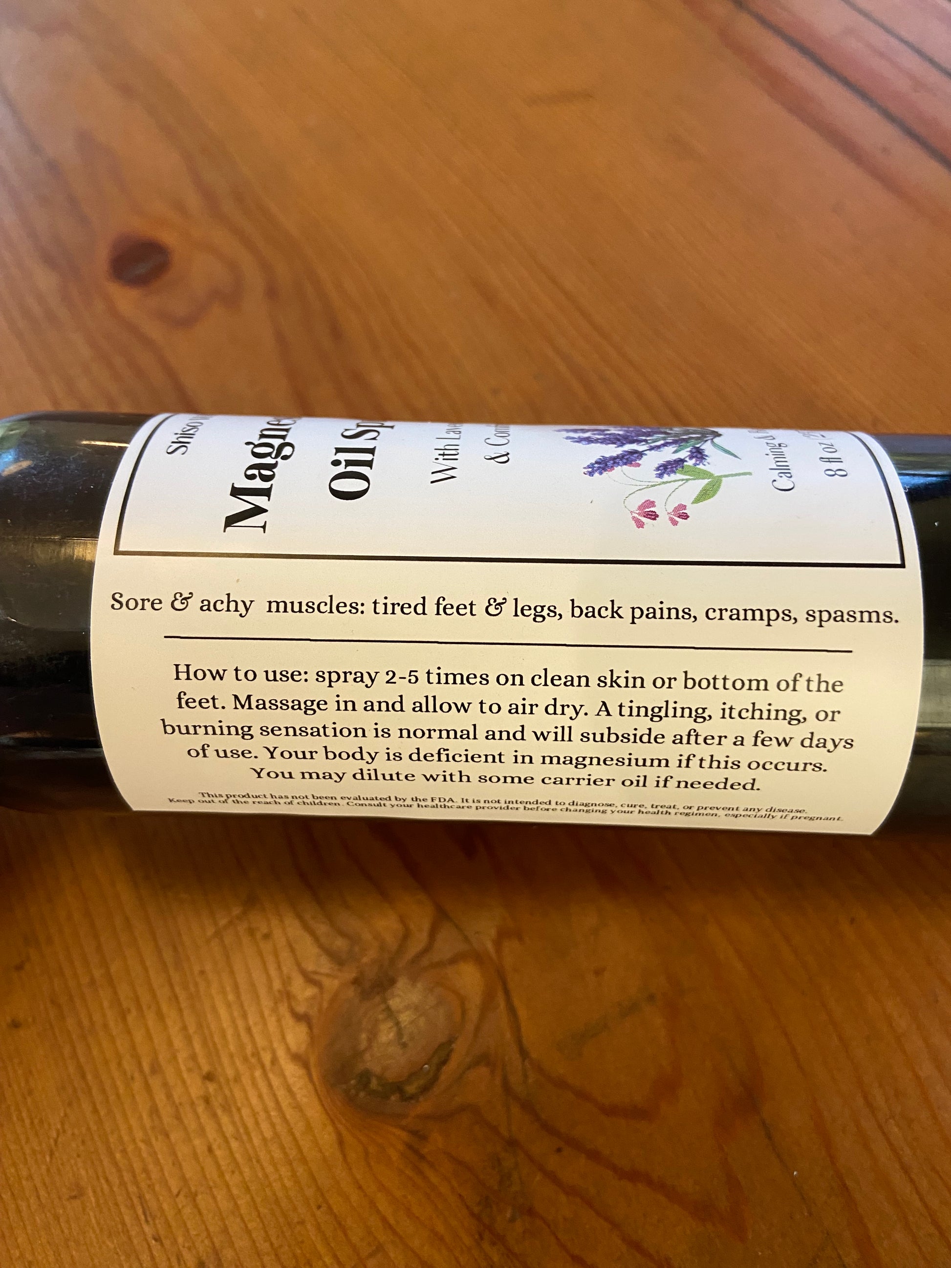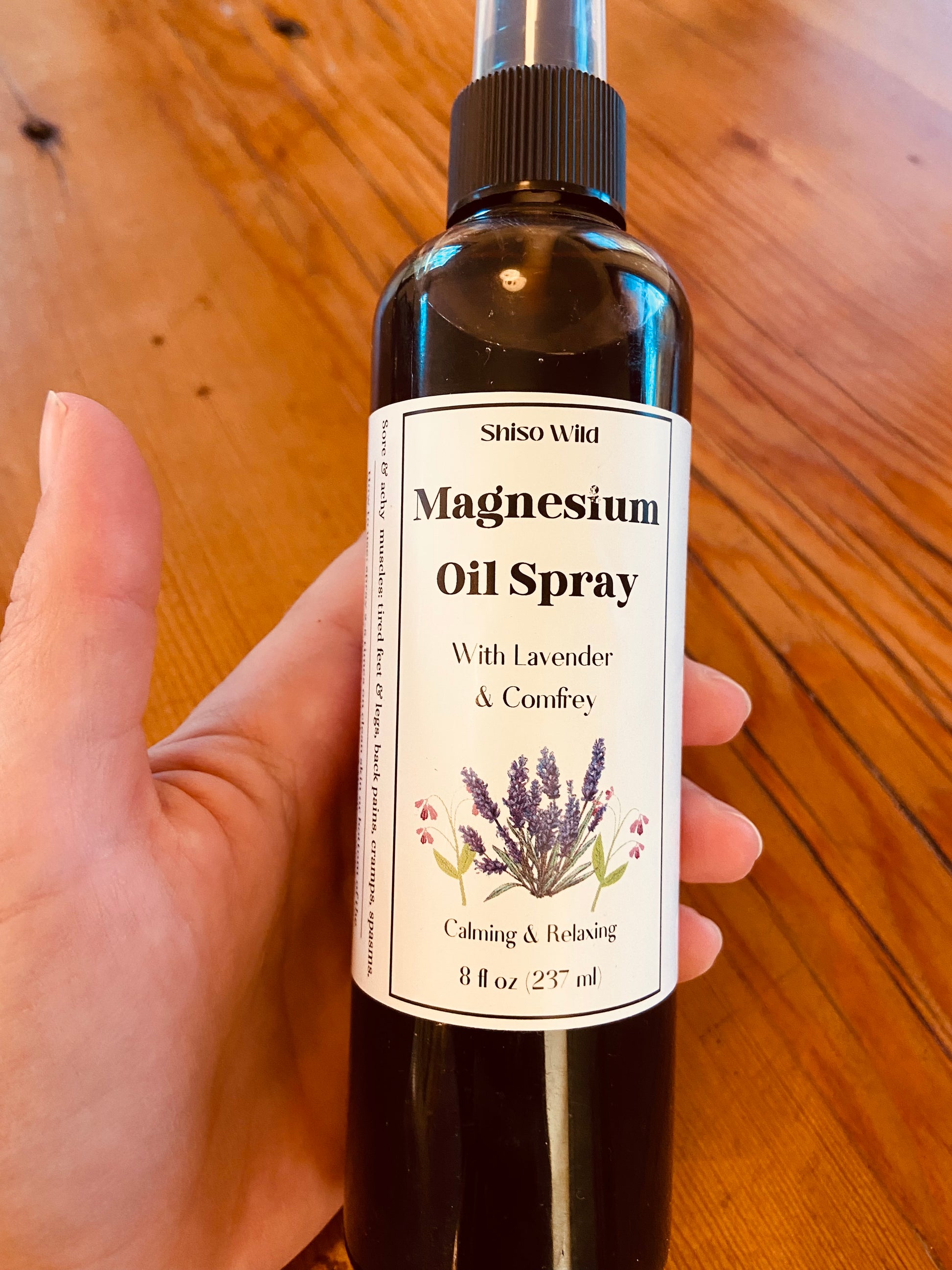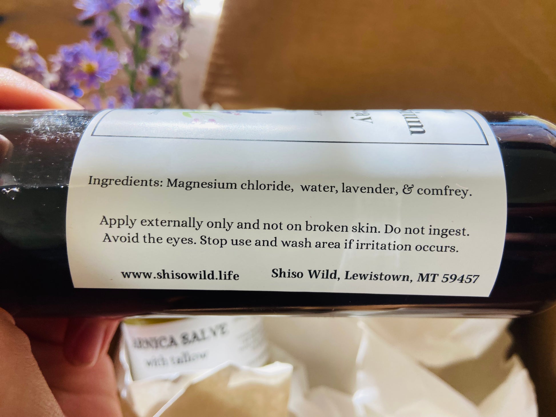 (1) Magnesium Spray. “For sore & achy muscles: tired feet & legs, back pains, cramps, spasms.” Ingredients: Magnesium chloride, water, lavender, & comfrey.